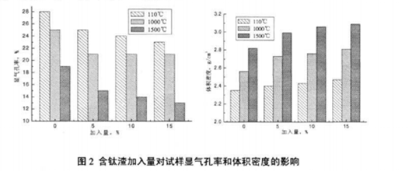 圖2所示為音鈦渣加入量對(duì)試樣顯氣孔牢、體積密度的影響。由圖可以看出.在熱處理后,試樣的 顯氣孔率和體積密度隨者含鈦渣的增加而呈現(xiàn)明顯的變化規(guī)律。試樣的顯氣孔率隨含鈦渣的增加而下 降,體積密度隨著含鈦渣的增加而上升。添加了古鈦渣的試樣相比空白樣而占,其顯氣孔牢有明顯的下 降,體積密度顯著增加.尤其是在1500℃的高溫處理后.舍釷渣試樣和空白樣的顯氣孔率和體積密度差 異明顯,這與上部分對(duì)試樣的線盤化率的影響分析相對(duì)應(yīng)。隨著熱處理溫度的升高,試樣的顯氣孔率減 小,體積密度相應(yīng)增大,明顯是含鈦渣的促燒原因。