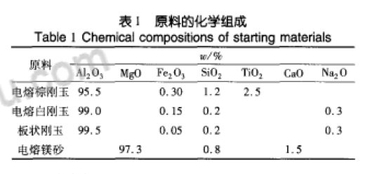 以電熔棕剛玉、白剛玉、板狀剛玉、鎂砂為顆粒料,鎂砂細粉、剛玉細粉為粉體,添加高溫復合促燒劑,以硼酸為外加劑。主要原料的化學組成如表1所示。