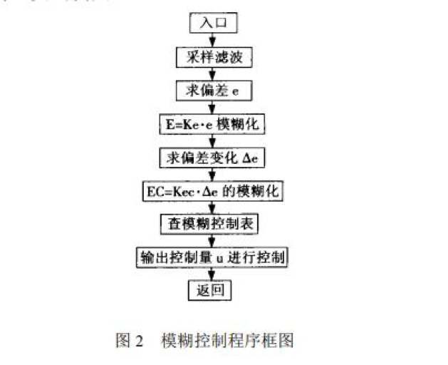 中頻爐溫度的模糊控制器是模糊控制系統(tǒng)的核心 ,它是一 種利用專家知識和操作者經(jīng)驗設計的專家控制系 統(tǒng) ,設計時不用數(shù)學解析模型來描述受控系統(tǒng)的 特性。在本溫度控制系統(tǒng)設計中 ,采用二維模糊 控制器 ,即以偏差 e 和偏差變化率Δe 作為模糊控制器的輸入變量 ,把加熱操作量作為輸出變量。 在模糊控制過程中 ,同時把偏差和偏差的變化率 作為模糊輸入量 ,這種方法不僅能保證系統(tǒng)控制 的穩(wěn)定性 ,而且還可減少超調量和振蕩現(xiàn)象。根 據(jù)受控系統(tǒng)的實際情況 ,確定輸入變量的測量范 圍和輸出變量的控制作用范圍 ,以確定每個變量 的論域 , Ke、Kec 和 Ku 分別為輸入和輸出變量的 量化因子和比例因子。先經(jīng)限幅處理 ,再經(jīng)量化 處理就得到了 E 和 EC。根據(jù)當前已求得的 E 和 EC ,直接查詢模糊控制表就獲得控制量的變化值 ΔU ,將該變化值ΔU 乘以比例因子 Ku ,即可得到 當前的實際控制量增量Δu。再將該增量和前一采 樣時刻的實際控制量相加 ,就得到目前應實施的 控制動作 ,即 uk = uk - 1 + Ku ·ΔU ,其模糊控制 程序框圖如圖 2 所示。