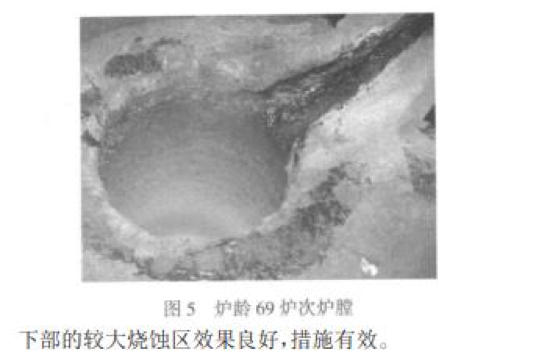 本次試驗爐齡 79 爐次達到了預期壽命,說明試 驗方案合理,試驗成功。從試驗過程中觀察到:中期 燒結(jié)有效地減緩了爐襯的損耗速度,措施有效;兩次 中修均達到了預期目的,使用短坩鍋中修應對爐膛下部的較大燒蝕區(qū)效果良好,措施有效。