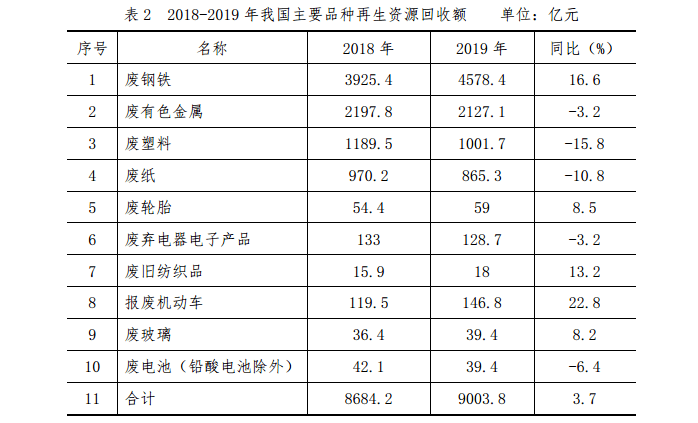 2019年,我國十大品種再生資源回收總額約9003.8億元,同比增長3.7%。報廢機(jī)動車、廢鋼鐵、廢舊紡織品、廢輪胎、廢玻璃等品種的回收額均有增長,其中報廢機(jī)動車回收額增幅最高,同比增長22.8%。2018-2019年我國主要品種再生資源回收額如表2所示。