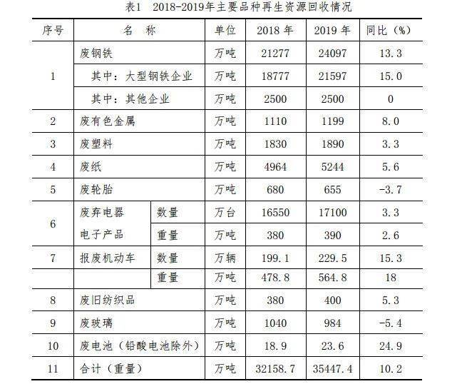 2019年,我國再生資源回收企業(yè)約10萬家,回收行業(yè)從業(yè)人員約1500萬人。截至2019年底,廢鋼鐵、廢有色金屬、廢塑料、廢輪胎、廢紙、廢棄電器電子產(chǎn)品、報廢機(jī)動車、廢舊紡織品、廢玻璃、廢電池十大品種的回收總量約3.54億噸,同比增長10.2%。2018-2019年主要品種再生資源回收情況如表1所示。