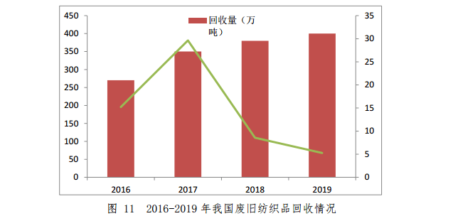 2019 年,我國棉、化纖和絲三類紡織纖維加工量約6610萬噸。據(jù)估算,每年產(chǎn)生廢舊紡織品超過 2000 萬噸,一類是消費前工業(yè)加工領(lǐng)域的邊角料等,基本得到再生利用,另一類是閑散在居民手中的大量廢舊衣物和紡織品,再生利用率約 15%。2019年,我國廢舊紡織品回收量約為 400 萬噸, 同比增長 5.3%。2016-2019年我國廢舊紡織品回收情況如圖 11 所示。