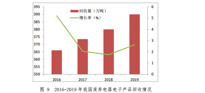 截至 2019 年底,全國共有 29 個?。▍^(qū)、市)的 109 家廢棄電器電子產(chǎn)品拆解處理企業(yè)納入廢棄電器電子產(chǎn)品處理基金補(bǔ)貼企業(yè)名單,電視機(jī)、微型計算機(jī)、洗衣機(jī)、電冰箱和空氣調(diào)節(jié)器的回收量約 17100 萬臺,報廢重量超過390萬噸。2016-2019 年我國廢棄電器電子產(chǎn)品回收情況如圖9所示。
