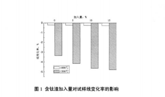 圖2所示為音鈦渣加入量對試樣顯氣孔牢、體積密度的影響。由圖可以看出.在熱處理后,試樣的 顯氣孔率和體積密度隨者含鈦渣的增加而呈現(xiàn)明顯的變化規(guī)律。試樣的顯氣孔率隨含鈦渣的增加而下 降,體積密度隨著含鈦渣的增加而上升。添加了古鈦渣的試樣相比空白樣而占,其顯氣孔牢有明顯的下 降,體積密度顯著增加.尤其是在1500℃的高溫處理后.舍釷渣試樣和空白樣的顯氣孔率和體積密度差 異明顯,這與上部分對試樣的線盤化率的影響分析相對應(yīng)。隨著熱處理溫度的升高,試樣的顯氣孔率減 小,體積密度相應(yīng)增大,明顯是含鈦渣的促燒原因。
