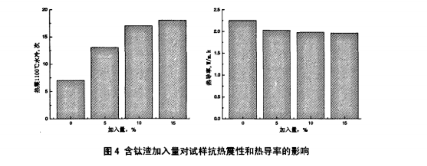 圖4所示為含鈦渣添加量對試樣抗熱震性和1000℃時熱導(dǎo)率的影響。由圖可以看出,含鈦渣的加入 明顯提高了試樣的抗熱震性,降低了試樣的熱導(dǎo)率,且隨著含鈦渣加入量的增加熱震次數(shù)呈上升趨勢、 熱導(dǎo)率呈下降趨勢。但隨著含鈦渣加入量增加,試樣的抗熱震性和熱導(dǎo)率改善趨緩,這可能是由于試樣 中雖有大量鈦酸鋁形成且量逐步增大,但試樣由于燒結(jié)好而致密化導(dǎo)致了未現(xiàn)明顯改善趨勢。