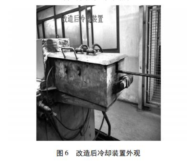 針對原中頻爐冷卻裝置存在的缺陷,經(jīng)過研究 并結(jié)合多年的設(shè)備、生產(chǎn)及工藝方面的相關(guān)經(jīng)驗,設(shè) 計出全新的 V 型直冷式可控大流量冷卻裝置。改 造后冷卻裝置內(nèi)部結(jié)構(gòu)如圖 5 所示,冷卻裝置外觀 如圖 6 所示。 改造后的冷卻裝置特點: ( 1) 新裝置采用加長 V 型水槽儲水冷卻,水槽將原來冷卻水管道直徑由 10 mm 增加到 16 mm,冷 卻水的供給量增大了 2. 5 倍。因為 V 型水槽容積 小能使冷卻水充分快速流動而帶走大量熱量,同時 由于儲水式冷卻能使鋼絞線始終浸泡在冷卻水中, 增大了冷卻的面積,只需一次冷卻即可將鋼絞線冷 卻至60 ℃以下,保證了冷卻的效果。 ( 2) 在冷卻裝置中加裝了導(dǎo)線輥,當生產(chǎn)線停 止運行時,中頻爐由位置 2 向位置 1 移動過程中,導(dǎo) 線輥與導(dǎo)線輪對下垂的鋼絞線起到支撐,避免鋼絞 線懸空,使鋼絞線不與噴氣吹干部分及 V 型冷卻水 槽接觸,不會對冷卻水槽產(chǎn)生磨損。 ( 3) 新的冷卻裝置與吹干裝置不會堵塞,完全 能在高溫、高油煙環(huán)境下正常工作,無需清理新的冷卻裝置與吹干裝置使用效果良好,適合所有規(guī)格鋼絞線的生產(chǎn)。改造成本低,使用壽命長。 既避免了鋼絞線整根斷裂,又消除了安全隱患,實現(xiàn) 了無人化操作,提高了鋼絞線的成材率和勞動生 產(chǎn)率。