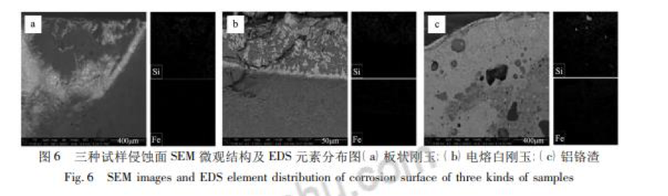 從圖 6b 中可以看出,試樣抗熔渣侵蝕和滲透能力均較強。當中頻爐熔渣與試樣接觸時,在工作層表面形成了 一個明顯的邊界層,這是由于基質中含有一定量的 Cr2O3,一方面 Cr2O3 與剛玉骨料形成固溶體,鋁鉻固溶體 的存在可阻止熔渣向內(nèi)部的侵蝕滲透,顯著提高其抗 SiO2-FeO 渣侵蝕性能。另一方面渣中的 FeO 和 SiO2 與 Al2O3 和 Cr2O3 成分反應生成鐵鉻、鐵鋁尖晶石、莫來石等高熔點化合物,生成的高熔點化合物填充于基 質和氣孔從而提高了材料的致密性度并且能有效的抵抗爐渣的侵蝕。圖 6c 為鋁鉻渣經(jīng)爐渣侵蝕后的 SEM 和 EDS 圖片,由于試樣氣孔率較高,且骨料雜質含量高,導致高溫燒成時液相量和基質遷移所造成的空隙增加。 高溫下,中頻爐熔融的爐渣和液相沿著氣孔、裂紋和空隙滲入材料內(nèi)部導致爐渣對試樣的侵蝕深度的急劇增加。