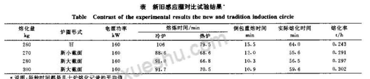 經(jīng)過(guò)更換中頻電爐感應(yīng)圈,改接電容器,完成了電爐的改造。在清華大學(xué)機(jī)械廠沙河分廠進(jìn)行了新舊爐型的對(duì)比試驗(yàn)。熔化材料為玲激合金鑄鐵,鐵水溫度1480℃。試驗(yàn)結(jié)果見(jiàn)下表。