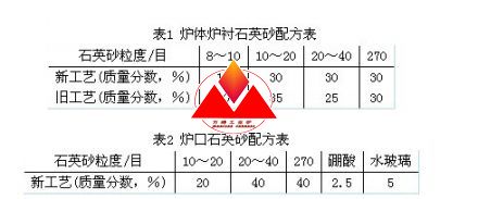 石英砂的粒度配比及搗固方法影響爐襯的使用壽命,其主要影響爐襯的耐蝕性能和抗高溫沖擊性能。經(jīng)試驗(yàn),爐襯的抗侵蝕能力與其基體密度成正比,密度越大,基體組織越密,爐襯的抗侵蝕能力越強(qiáng)。在結(jié)合客戶實(shí)際生產(chǎn)的基礎(chǔ)上,采用表1所示的石英砂配方。爐口石英砂采用表2所示的改進(jìn)配方。