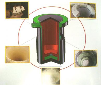 在加爐襯料時由于坩堝的設(shè)計和爐子的需要,這個在爐襯底部會有一段斜坡,此位置直接關(guān)系到爐襯的使用壽命,在施工斜坡位置時重點就是要注意此位置石英砂的排氣工作,由于斜坡位置的爐襯料不是垂直的,在用震動馬丁震實時此位置的爐襯料不能完全靠自身的重力來增加料的密度,為了能使石英砂能達到更好的密度,在這個位置我們一般才用少加料,多排氣的方式來進行施工,此位置每次的加料高度應(yīng)保持在5-6CM,先找平然后再進行排氣6-8遍,排氣完成后進行刮毛然后再進行第二次加料,在施工部位超出斜坡部位后,加料的厚度可以有所增加,但也應(yīng)該保持在10CM以內(nèi)。整個爐襯施工中一定要仔細認真,在每進行一次加料工作后要用手電等照明工具來觀察加料的情況,要確認備襯沒有被爐料沖開,以及有沒有異物進入爐料。每次排氣后還應(yīng)該進行確認備襯情況是否完整,有沒破損等。整個爐襯加料完成后把坩堝用電焊固定住,可以防止坩堝在進行震實作業(yè)時出現(xiàn)移位。在震實作業(yè)前還應(yīng)予留一部分爐料,用來及時補充在震實過程中下降的爐襯料,有條件此位置應(yīng)該用封口料最好。由于我們是使用氣動馬丁來震實爐襯料,一般要求氣壓最少要有0.42Mpa,然后震實3分鐘以上,如果氣壓不夠大,可適當延長震動時間,一定要確保爐襯料有一個足夠的密度。同時在震實時還要注意馬丁的固定情況,如有松動現(xiàn)象立即關(guān)掉氣壓,緊固后再進行震實作業(yè)。